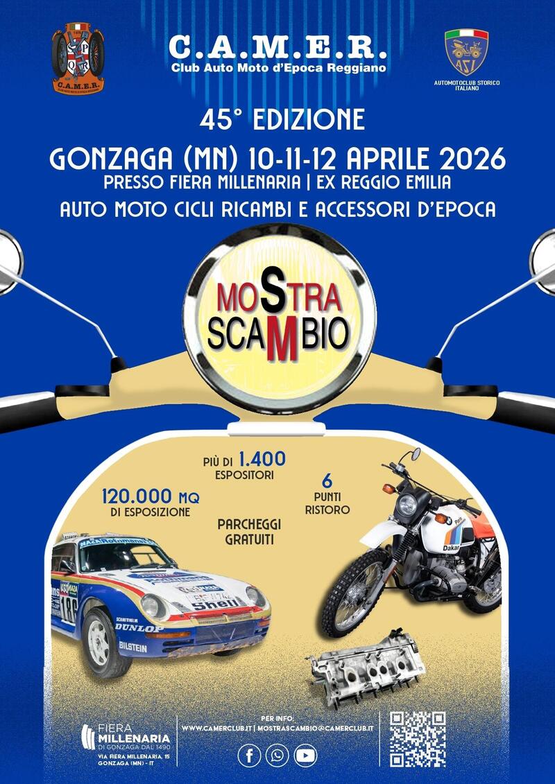 Quarantacinque edizioni sulle spalle, cinquant’anni di storia per il club organizzatore e un’edizione 2026 che punta a essere la più completa di sempre. La Mostra Scambio CAMER 2026 torna dal 10 al 12 aprile alla Fiera Millenaria di Gonzaga, confermandosi uno degli appuntamenti più importanti in Italia e in Europa per chi vive la passione per moto e auto storiche.