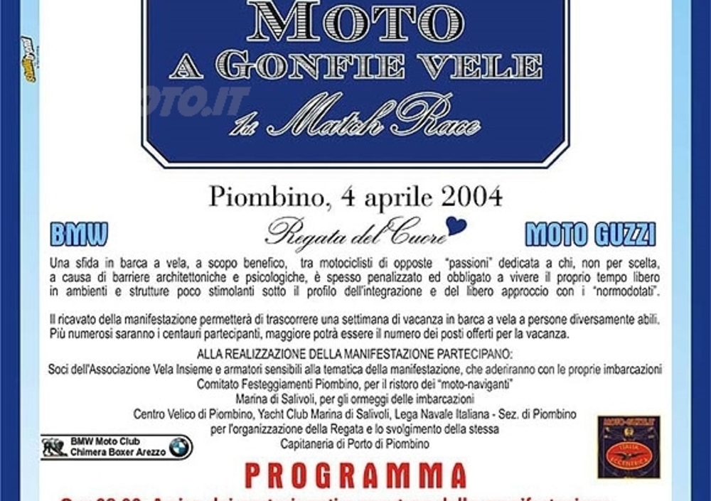 S’inaugura a Piombino domenica 4 aprile la manifestazione “Moto a Gonfie Vele” con il I Match Race BMW-Moto Guzzi. Una sfida in barca a vela a scopo benefico, tra motociclisti di opposte “passioni”, a sostegno dell’integrazione delle persone con disabilità, con il patrocinio della Federazione Motociclistica Italiana. A bordo delle imbarcazioni dell’Associazione Vela Insieme, Ribot e Tornese, equipaggi dei due prestigiosi marchi si sfideranno su un percorso a bastone nelle acque antistanti Marina di Salivoli. All’iniziativa hanno dato la loro adesione il Moto Guzzi World Club (MGWC) e il BMW Motorrad Italia.