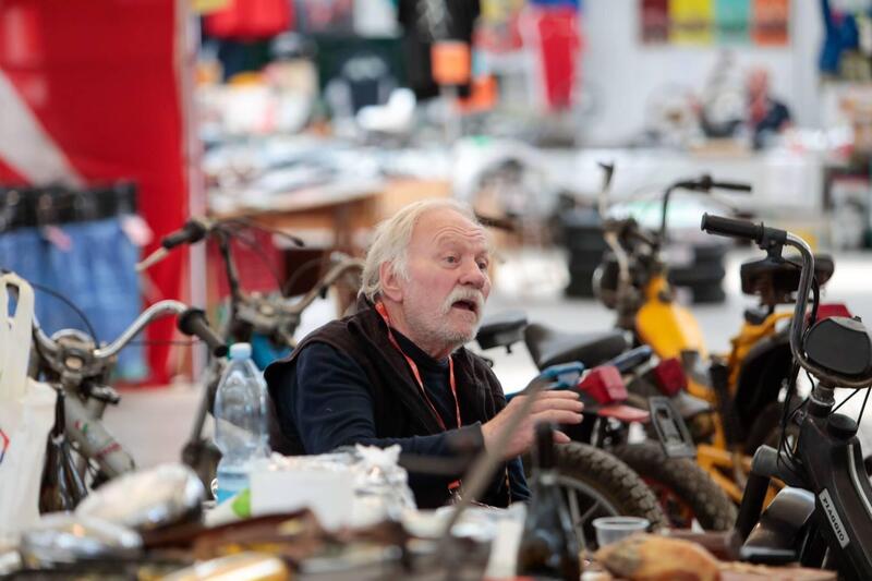 In terra una dozzina di forcelle complete di Vespa. Ruggine, polvere, grasso. Che cavolo ci stanno a fare? E dove è il resto, le Vespe? Come è possibile che uno raccolga forcelle, o telai, selle, motori con una così scarsa probabilità di riutilizzo? Perché la possibilità è scarsa ma non nulla, e si può immaginare la soddisfazione reciproca se un pezzo improbabile passa dalla mano che l’ha conservato a quella di chi lo cercava. Vale per i pezzi e per le moto intere, targate o dismesse, per auto, trattori, per gli oggetti che hanno arredato le rimesse, insegne, pompe di benzina, fusti d’olio, anche le confezioni quando degne di una qualche attenzione. Ci vuole una particolare attitudine, e ci vuole essere disposti a conoscere tutto degli oggetti, dalla storia al segno di un utilizzo illustre o caratteristico. Insomma, alla mostra-scambio è sempre gente interessantissima.