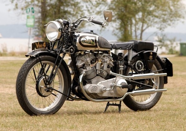AJS era un costruttore britannico di motociclette che è riuscito ad ottenere alcuni successi nelle corse all'inizio del XX secolo. Negli anni '30 costruì la V-4, moto che aveva un motore V4 da 500 cc, un qualcosa di unico all’epoca, con un angolo di 50 gradi tra le bancate dei cilindri, e si sospettava che ci fosse abbastanza spazio per un compressore se AJS avesse mai voluto aggiungerne uno. Il V-4 non è mai entrato in produzione e sono state prodotte solo una trentina di esemplari da corsa. Queste moto correvano in diverse configurazioni; alcune erano raffreddate raffreddate ad aria, altre ad acqua e alcune sovralimentate, correndo al TT dell'Isola di Man. A causa della poca affidabilità, negli anni si pensa che sia sopravvissuta solo una di queste trenta moto, un esemplare del 1939 raffreddato ad acqua.