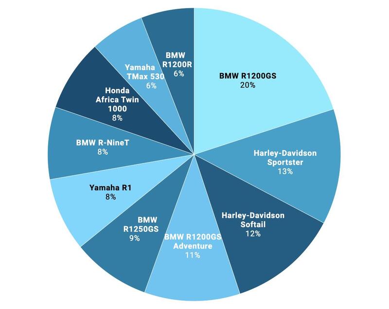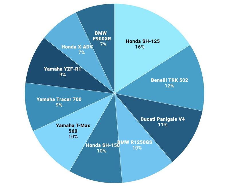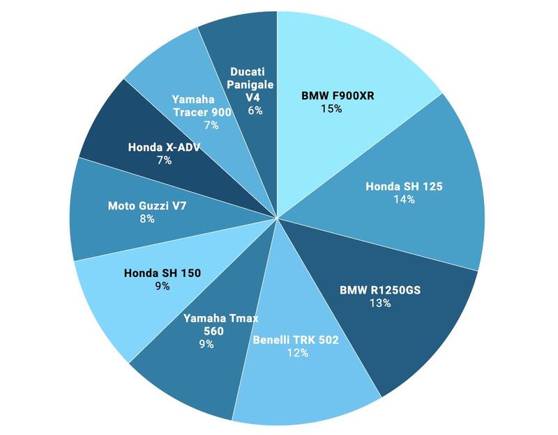 Tra le moto più cercate, in prima posizione c'è una delle più attese novità inedite della stagione, ovvero la crossover BMW F900XR, seguita da modelli che sono tra i best seller delle ultime stagioni, BMW R1250GS in primis, che svetta nelle vendite nel primo trimestre ed è il modello stabilmente più venduto degli ultimi anni, come pure c'è poi la Benelli TRK 502 altro modello di grande successo: è stato il terzo più venduto del 2019 e si è assestato è in settima posizione nel primo trimestre di quest'anno.
