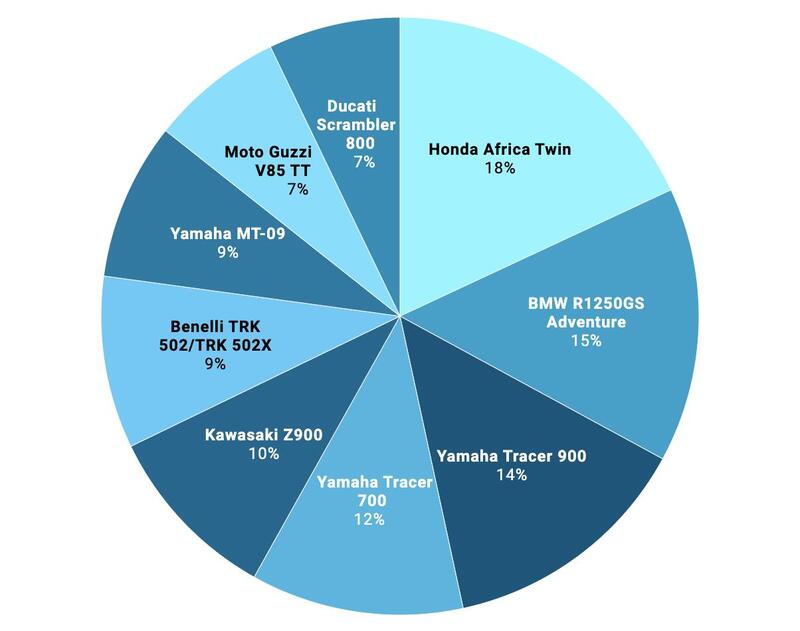 Questi primi tre modelli appartengono alla categoria delle moto caratterizzate dalla guida a manubrio alto, nella fattispecie crossover ed enduro stradali. Due segmenti che insieme compongono la tipologia di modelli più acquistata nel 2019 e anche nei primi mesi di quest'anno.