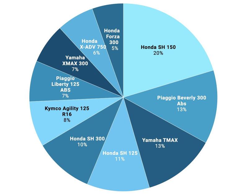 Nelle vendite del primo trimestre 2020 davanti a tutti c'è la versione SH150, che precede il Piaggio Beverly 300 (fuori dalla Top Ten delle ricerca) e poi ci sono il maxi scooter Yamaha TMAX 560 (novità 2020 e secondo scooter più cercato) seguito dall'SH125. Va ricordato che la cilindrata fino a 125 cc rappresenta quella più venduta in Italia.