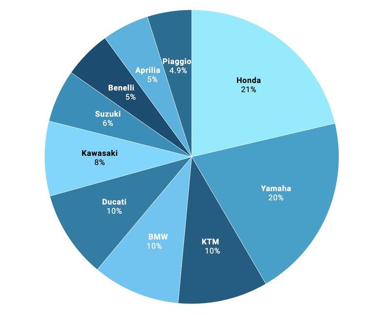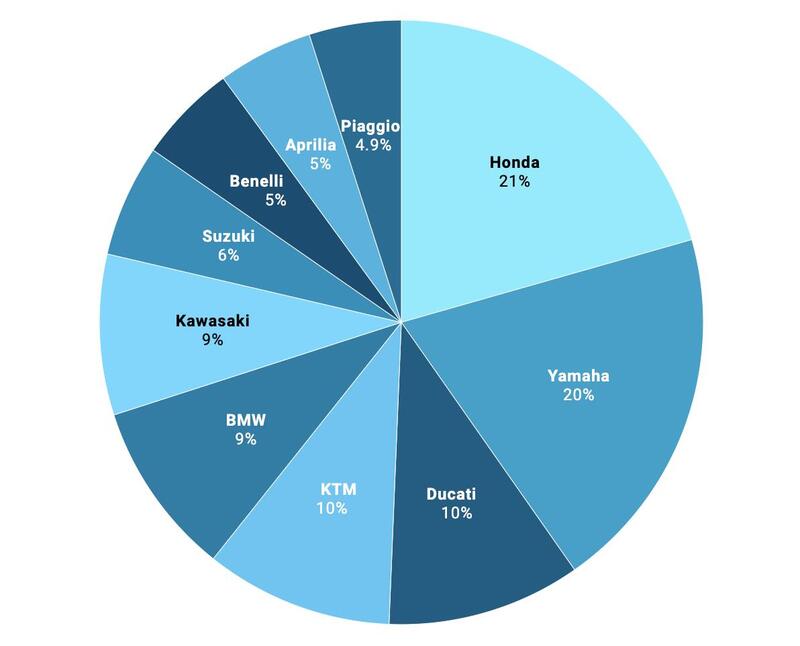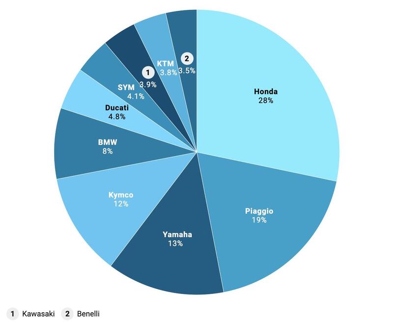 La classifica delle vendite per marche del 2019 conferma la leadership di Honda, seguita da Piaggio (al secondo posto ma con una gamma puramente scooter che comprende anche il marchio Vespa), e poi da Yamaha.