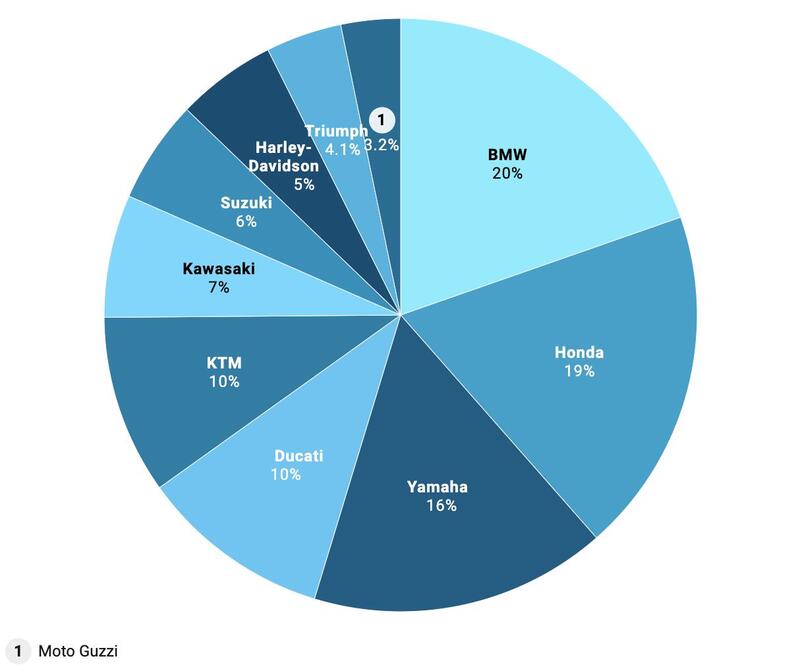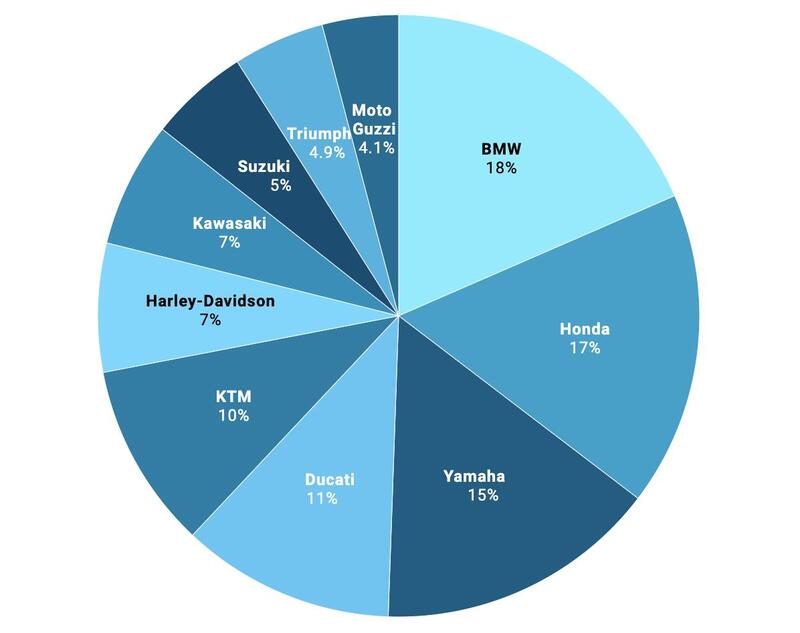 Ducati ha guadagnato qualche posizione nella graduatoria dei primi mesi del 2020 e nel gruppetto che segue il podio ci sono marche motocilisticamente importanti come KTM e BMW.