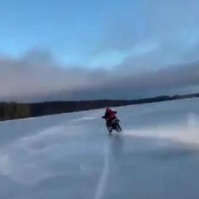 Guidare una moto su una strada ghiacciata non è semplice e questo è risaputo. Ma se si procede a passo d’uomo e con la giusta attrezzatura ci si può anche riuscire.