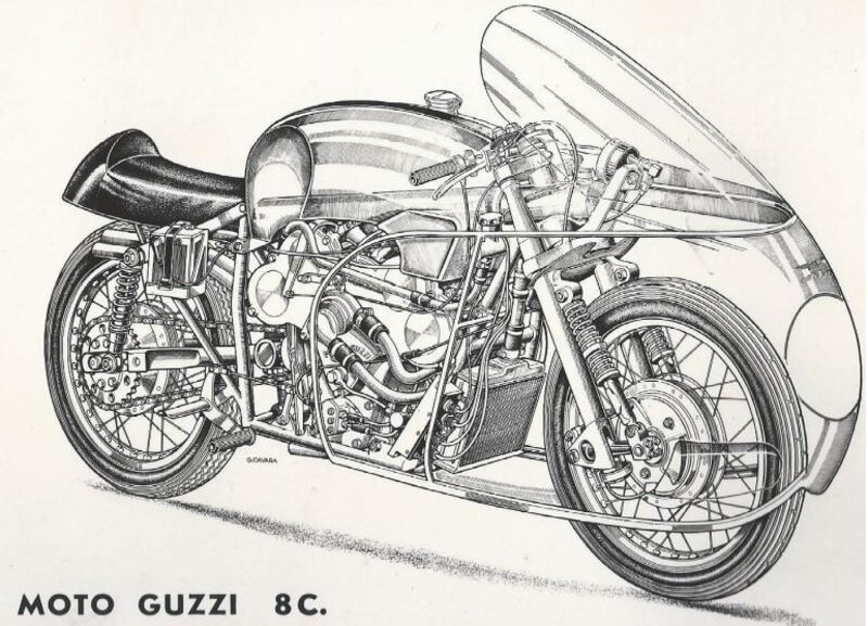 Nel febbraio del 1955 veniva distribuito da Fergus Anderson, decano dei piloti Moto Guzzi e in quell’anno direttore sportivo, un comunicato stampa in lingua inglese: in allegato c’era il disegno di una moto in via di ultimazione a Mandello, un disegno schematico che lasciava il mistero assoluto su quali potessero essere le caratteristiche e l'architettura del motore.