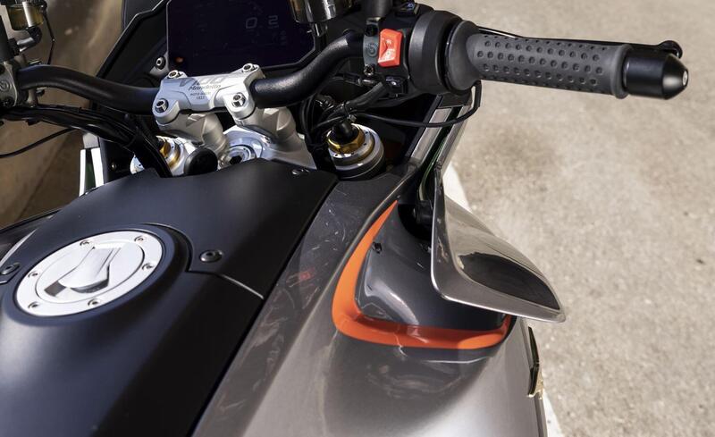 Un'altra anteprima, non soltanto di Moto Guzzi, di cui si fregia la Mandello è l'aerodinamica adattiva. Oltre al cupolino regolabile in altezza elettricamente per un'escursione di 90 mm, ci sono infatti due appendici aerodinamiche mobili ai lati del serbatoio e immediatamente alle spalle del cupolino.