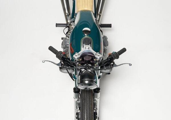 Il piccolo codino arrotondato e con una inconsueta scanalatura centrale ingloba una compatta e non visivamente ingombrante luce led. La sella è in pelle color crema e si lega molto bene con la verniciatura in verde con alluminio lucidato in contrasto. Due tinte utilizzate in passato sulle moto italiane.