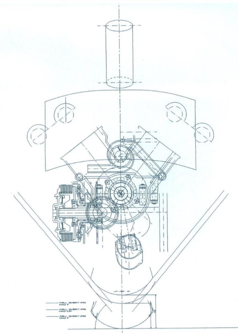 Ma torniamo al progetto VA-10. L’imposizione da parte del marketing di utilizzare la classica configurazione a V di 90° fronte marcia pose subito due gravi problemi per una moto super sportiva: il primo riguardava chiaramente l’ingombro frontale del motore, mentre il secondo era inerente alla definizione del posizionamento del cambio a 6 marce per un’uscita della trasmissione finale a catena. Ma questi due problemi apparentemente gravi si rivelarono poi un grandissimo vantaggio nella definizione del prodotto, perché costrinsero l’ing. Ferrari a uscire dagli schemi consolidati e cercare, in accordo con la direzione marketing, nuove soluzioni non ortodosse per la nuova moto. In merito all’ingombro frontale del motore, ricordando gli elementi basilari dell’equilibratura dei motori bicilindrici a V, Ferrari escogitò alcuni escamotage.
