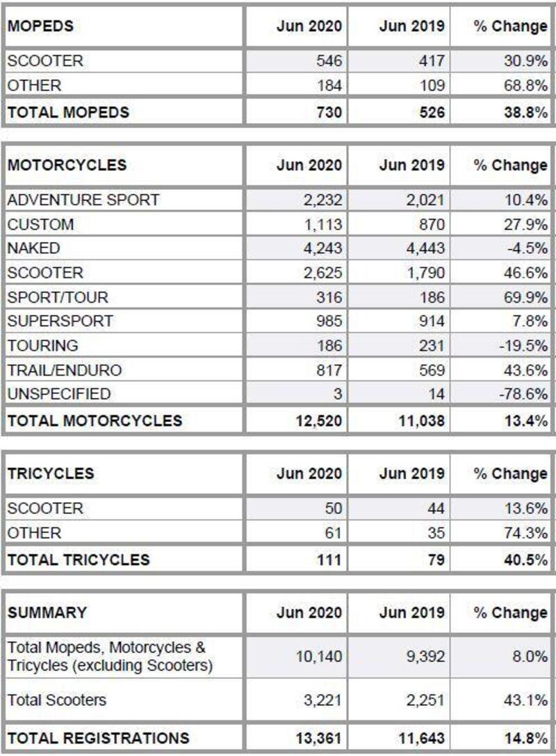 Grazie alla ripresa di giugno il primo semestre ha visto un totale di 44.206 unità vendute (i ciclomotori sono stati 2.461) ovvero un saldo di -25,7% sul primo semestre del 2019.
