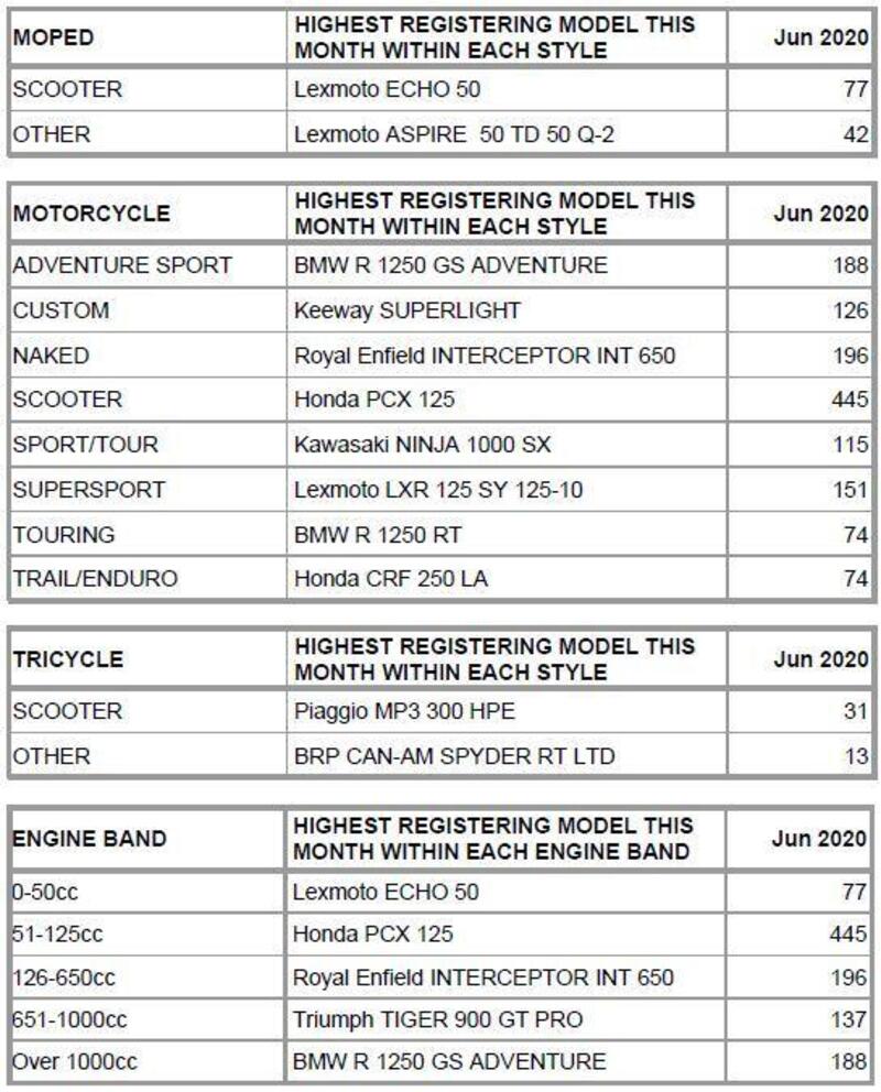 Fra le moto è da registrare anche a giugno, come a maggio, l'ottima prestazione della Royal Enfield Interceptor 650 che con 196 unità mensili è stato il modello più venduto.