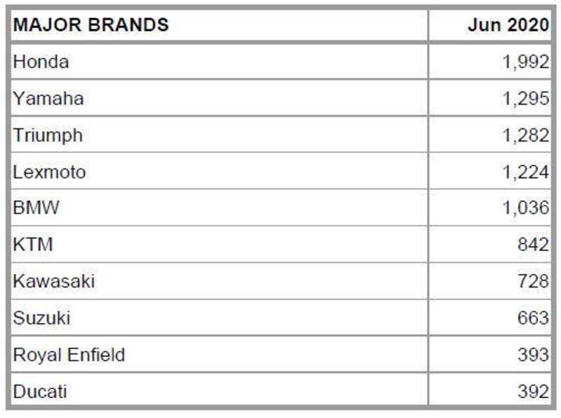 Nella classifica per marche al primo posto c'è Honda (1.992 unità mensili), seguita da Yamaha (1.295) e Triumph (1.282). Proprio la Tiger 900 GT Pro è al primo posto nella categoria 650-1000 cc (con 137 unità).