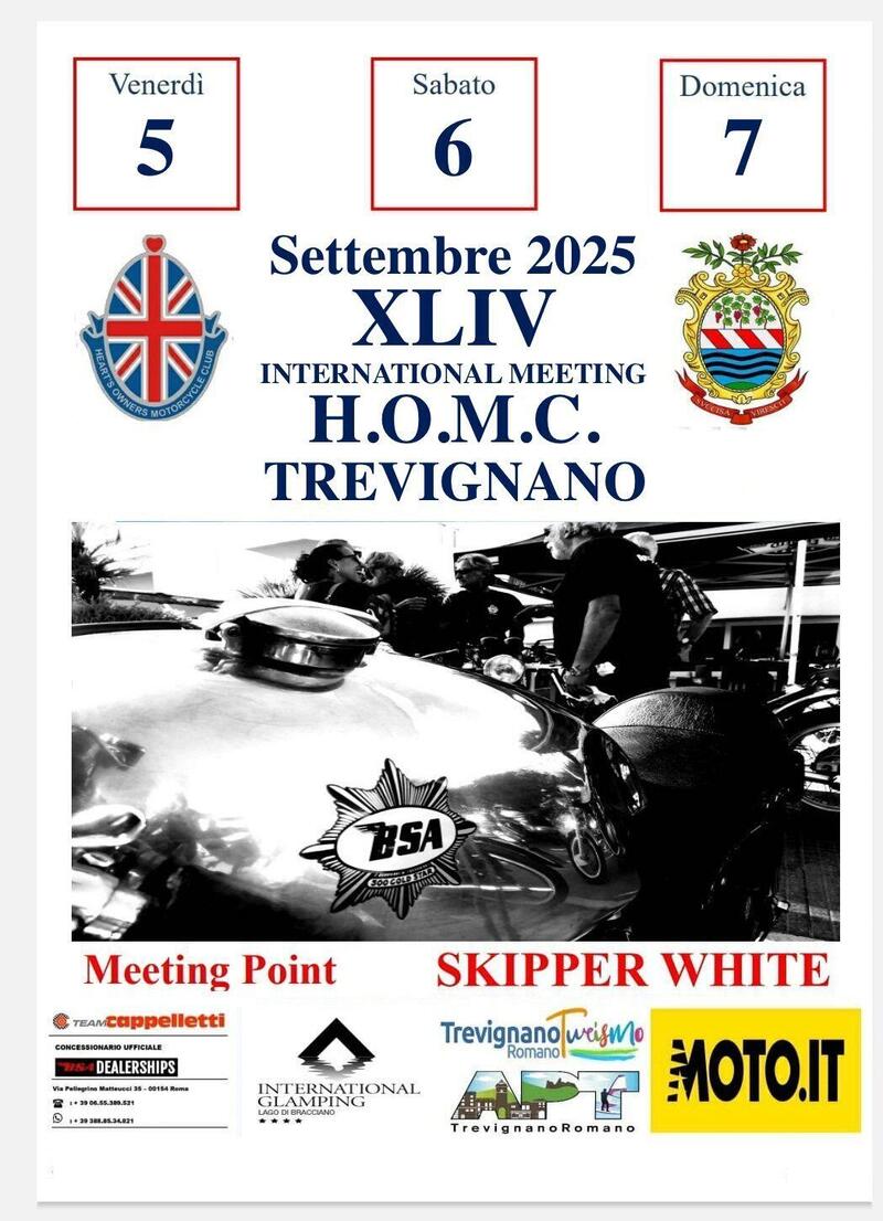Edizione 44, che non sono i famosi gatti di cui si cantava allo Zecchino d’Oro di diversi anni fa: sono piuttosto già quarantaquattro le edizioni deIl’International Meeting di Moto Ingelsi Classiche che con caparbietà, dedizione e molta passione l'Heart' Owners Motorcycle Club di Roma organizza dal 1982 nella tradizionale collocazione temporale del primo weekend end di settembre, mentre come ormai prassi la location fisica è quella confermatissima e suggestiva del lago di Bracciano, alle porte della Capitale tra le provincie di Roma e di Viterbo, lungo l’asse nord della Cassia.