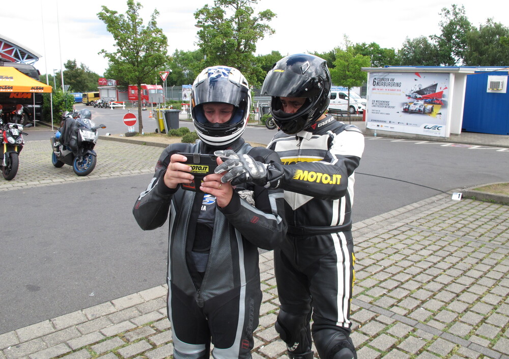 Il tempo non è dei migliori, il primo giro sul tracciato del ring infatti sarà con l'asfalto bagnato. Prima di indossare le tute però ci raduniamo con tutti i piloti presenti per il briefing con gli istruttori, peccato parlino in tedesco, io e Andrea ci guardiamo un po' perplessi e ci fingiamo interessati per non sfigurare. Una volta terminato, chiediamo lumi a Frank che professionalmente ci spiega come comportarci in pista, categoricamente dice: "ragazzi, dovete fare esattamente quello che faccio io, seguite le mie linee e frenate il meno possibile, non siate bruschi".