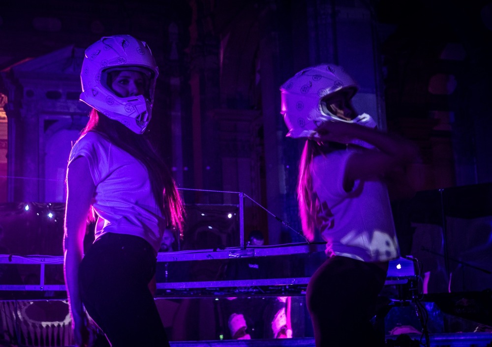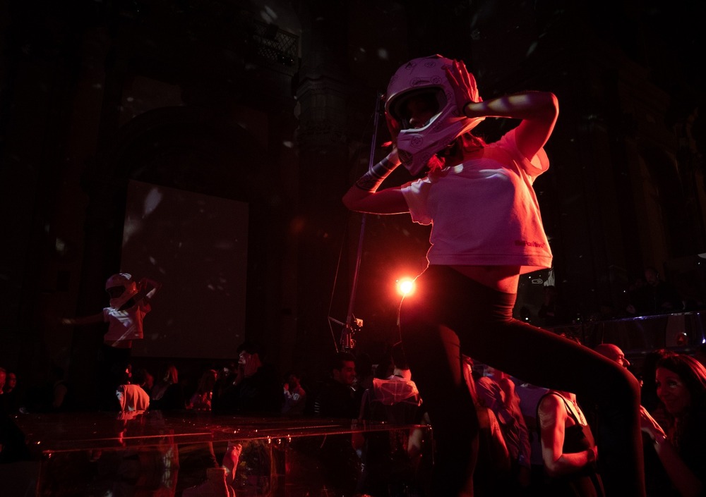 Ore 2:00. Sul sagrato transennato di Santo Stefano ancora la fila. Dentro, più di duemila persone con il ditino che punta la cupola. Si balla, si suda, si balla, si gode, qualcuno chiede il casco a una modella perché fa figo, perché è un pezzo d’abbigliamento, perché chissenefrega: la pista della discoteca stanotte è come la strada, ma la protezione non c’entra, c’entra lo stile. E quello, se non lo avete capito, passa dall’asfalto al dancefloor senza chiedere nessun permesso.