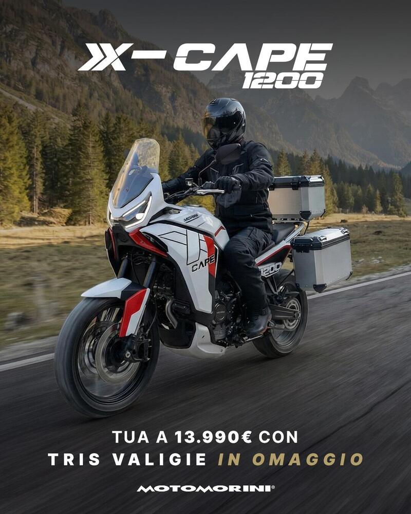 Moto Morini dà il via alla stagione 2026 con una ghiotta promozione dedicata alla gamma X-Cape. Fino al 30 aprile, sconti e regali rendono questi modelli più accessibili. Naturalmente la star è l’ultima arrivata, la X-Cape 1200: per lei solo 13.990 euro e in omaggio il tris di valigie, un kit da viaggio che moltiplica capacità di carico, versatilità e comfort. Ideale per il turismo ad ampio raggio questa maxi crossover unisce potenza e dotazioni premium. Offre un iconico V2 da 1187cc, 129cv e 107Nm di coppia massima.