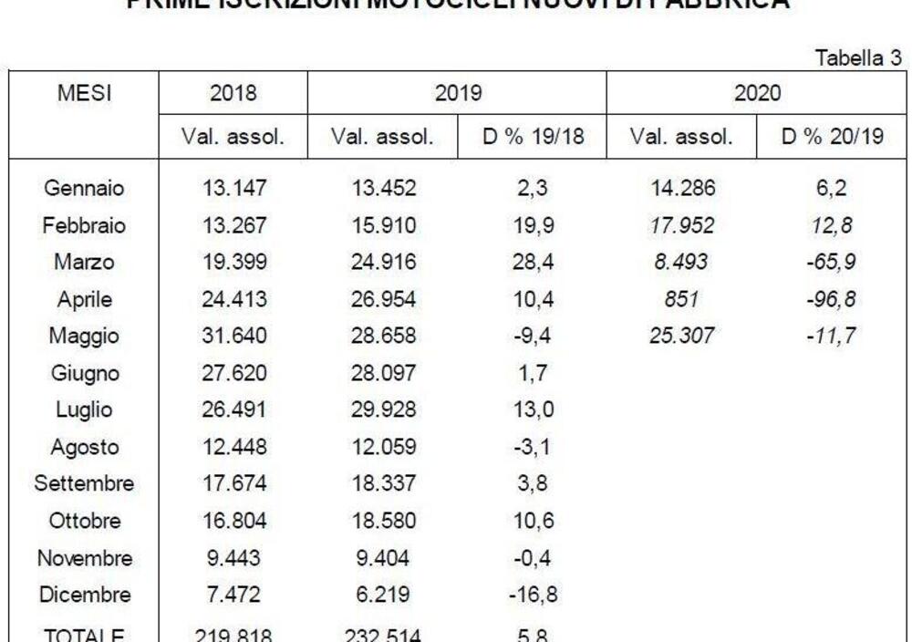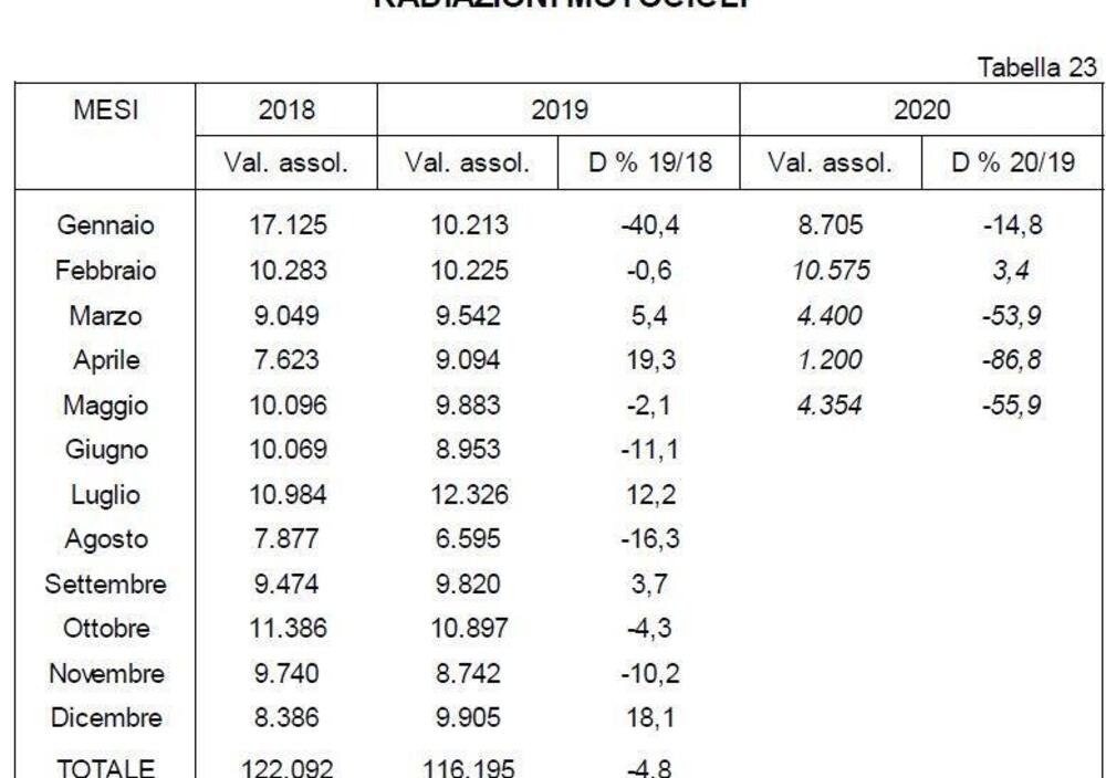 Le radiazioni sono invece più che dimezzate, con quelle dei motocicli a -55,9% e quelle delle auto a -56,6%. Nei primi cinque mesi di quest'anno la variazione è stata rispettivamente del 40,3 e del 40,7%.
