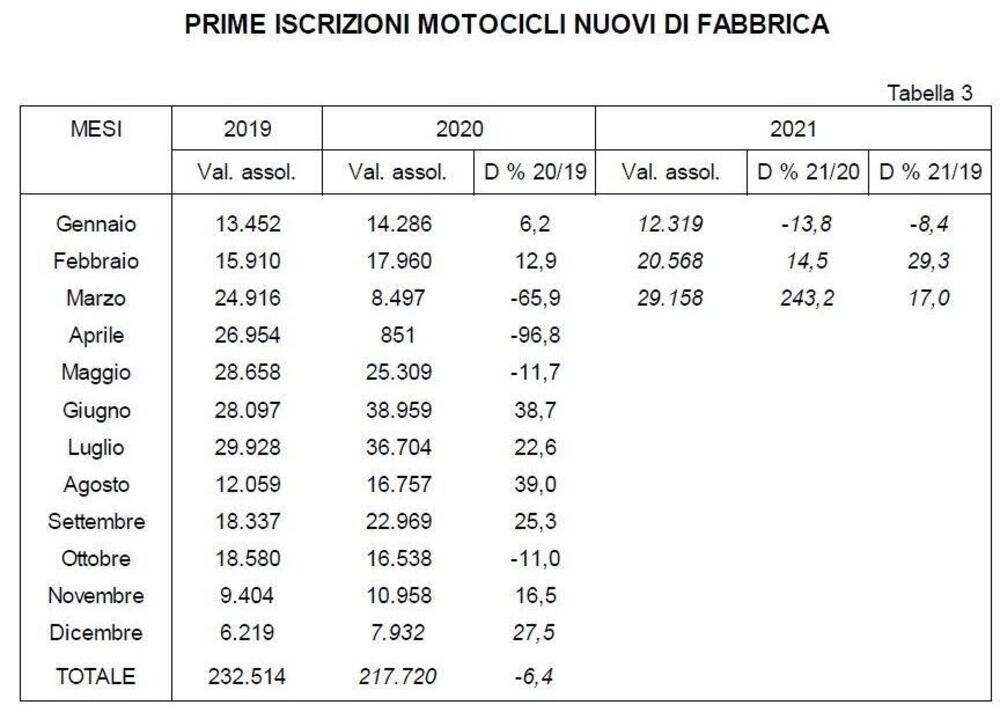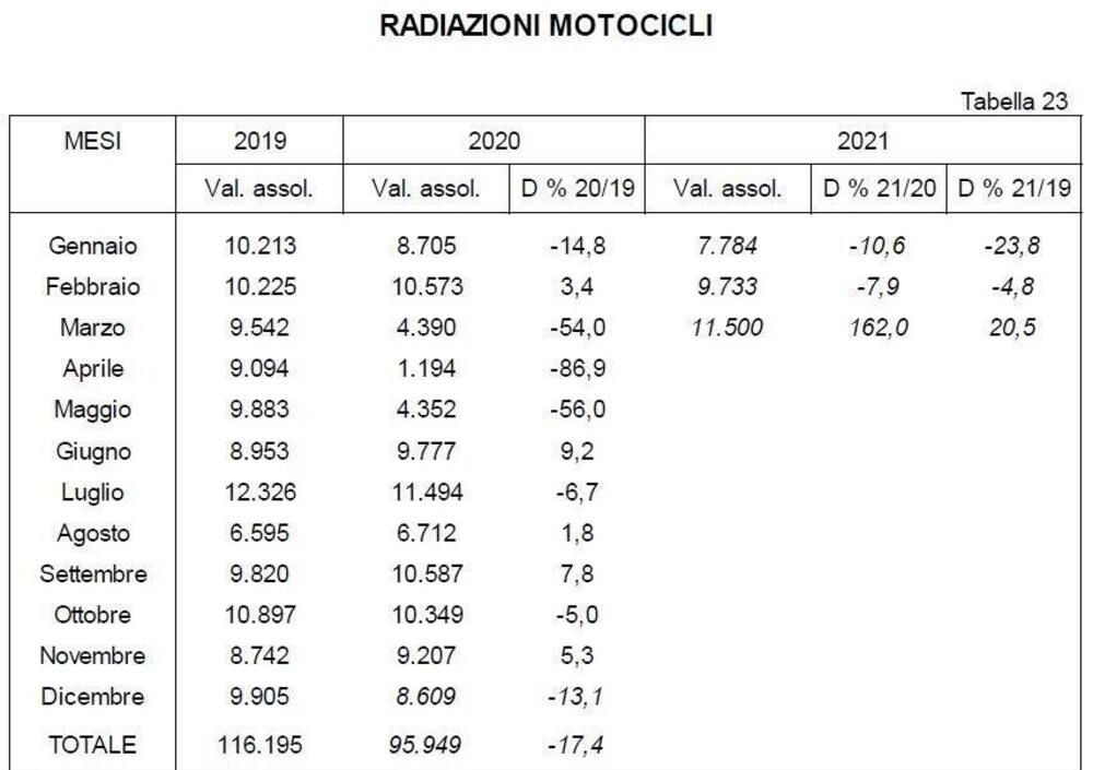 Se le nuove immatricolazioni di marzo sono aumentate del 15% rispetto allo stesso mese del 2019 (questo secondo il dato fornito da ANCMA, mentre quello dato dall'ACI nel suo bollettino mensile Auto Trend indica un +17%: dipende dal diverso aggiornamento numerico), i passaggi di proprietà sono aumentati del 18,7%, addirittura di un +251% su marzo 2020 ma che è stata appunto determinato dal lockdown.