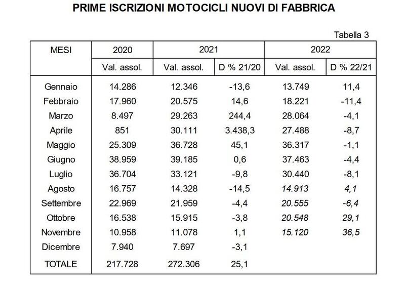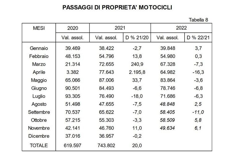 Sul fronte delle immatricolazioni di moto nuove, si proviene da un bimestre fortemente positivo (rispetto al 2021: ottobre +29,1% e novembre +36,5%:) in attesa della pubblicazione dei dati relativi a dicembre 2022 il risultato complessivo rispetto al 2021 parla di un -0,7% e di 262.878 unità. Di tutt'altro profilo, invece, i dati afferenti l'immatricolato autovetture: nei primi undici mesi del 2022 in confronto allo stesso periodo del 2021 il calo è stato del 14,6%. In ogni caso, le percentuali e i numeri relativi agli ultimi 4 mesi sono da ritenersi da consolidare ed è possibile uno scostamento dal dato reale fino al 5%.