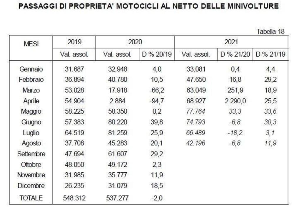 Un andamento molto simile si nota nel mercato dell'usato dei motocicli (i dati forniti dal bollettino mensile AutoTrend dell'ACI sommano infatti moto e scooter, vendite fra privati e dai concessionari), con il mese di agosto che ha visto 42.196 passaggi di proprietà netti. Vuol dire un calo del 6,8% rispetto alle 45.283 unità di agosto 2020, ma anche un +11,9% rispetto ad agosto 2019 (con 37.7089 passaggi).