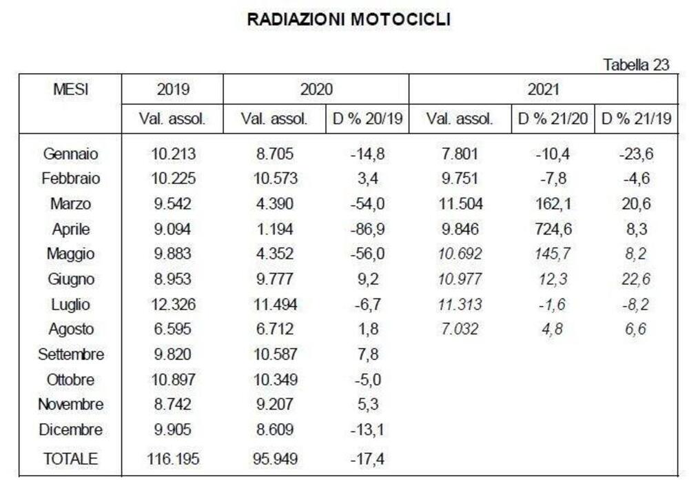 Nei primi otto mesi il totale delle radiazioni dei motocicli vede 78.919 pratiche: +38% sul 2020 e +2,7% sul 2019.