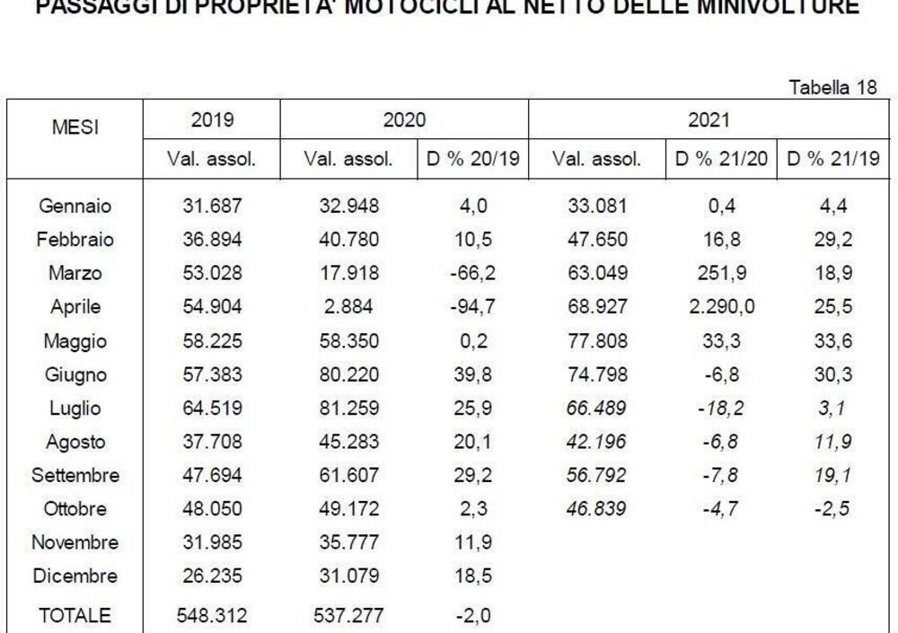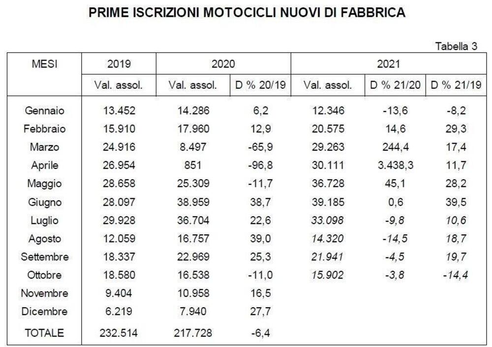 Va precisato che le nuove moto sono state in realtà in aumento del 3,8%, ma il calo del 2,4% degli scooter – che rappresentano un volume superiore – ha determinato il saldo negativo complessivo.