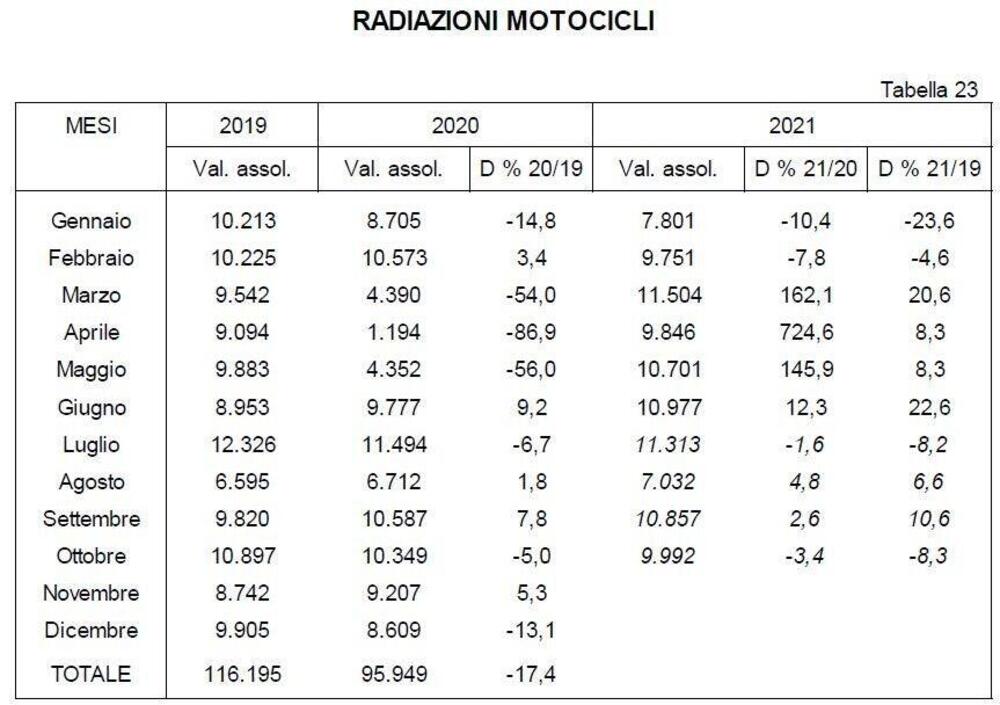 A ottobre sono state in contrazione anche le radiazioni di moto e scooter superiori a 50 cc. In tutto sono state 9.992, in diminuzione del 3,4% su ottobre 2020 e dell'8,3% su ottobre 2019.