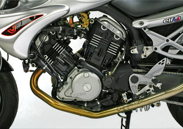 Dal punto di vista tecnico si trattava di una proposta ardita. Il motore, presentato nel 1992, era raffreddato ad acqua. La cilindrata, inusitata per l’epoca, era di ben 1596 cm3 e veniva ottenuta abbinando un alesaggio di 110 mm (record per il settore moto, fino alla comparsa del bicilindrico Ducati Panigale “Superquadro” 1200) con una corsa di 84 mm. La V tra i cilindri era di 53° e la distribuzione era monoalbero a quattro valvole. L’albero a gomiti, che lavorava interamente su bronzine, aveva due perni di manovella sfalsati di 74° e separati da uno stretto volantino centrale.