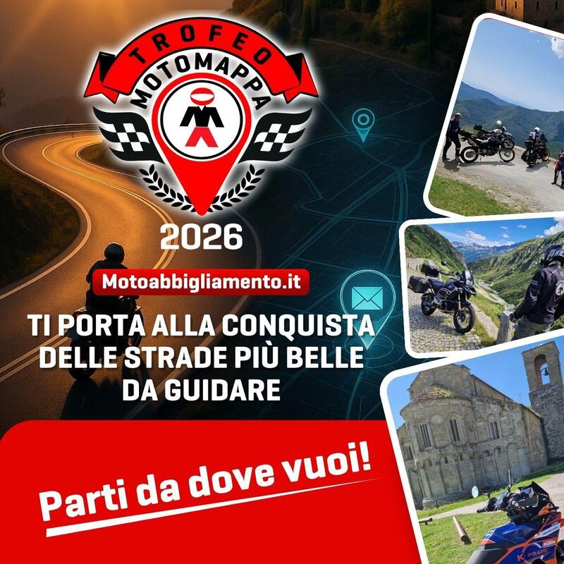 Viaggiatori, è in arrivo una piacevole sorpresa! Nasce il Trofeo Motomappa, il nuovo progetto di Motoabbigliamento pensato per tutti i motociclisti che vedono nel turismo in moto un'opportunità unica di scoperta e libertà. Un trofeo che esalta il puro piacere del viaggio, dei bei panorami e le esperienze condivise lungo percorsi indimenticabili sul territorio italiano.