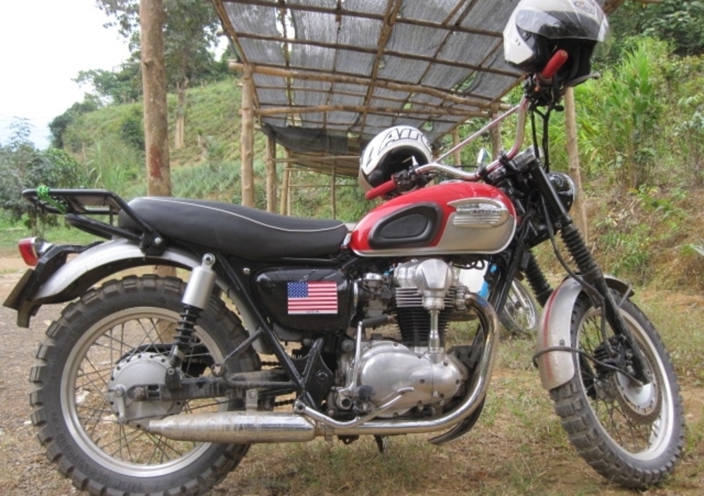 Nelle città più popolose si incrociano poi degli accrocchi con la testa di una moto e il corpo di un pulmino, spinti da motori monocilindrici e inclinazioni del cannotto di sterzo più in piedi di una MotoGp per girare strettissimi nelle strade alla ricerca di clienti da trasportare per pochi spiccioli, soprattutto turisti e monaci buddisti; raramente si incrociano moto di cilindrata maggiore dei canonici 250, ma una notte che aspettavo pazientemente appostato una processione di monaci ho scovato parcheggiate fuori da un albergo di Luang Prabang (Laos) una KTM Adventure, una Triumph Bonneville, una Kawasaki GTR, tutte con targhe laotiane e ancora ho un bellissimo ricordo della W650 modificata in stile on any sunday, sempre con targa del Laos, trovata vicino ad un tempio a Champasak. Ci avevo fatto un pensierino, era bella davvero: ho atteso per un po’ il proprietario ma non arrivava e alla fine gli ho lasciato un biglietto con il mio numero di telefono, telefonare ore pasti. Niente da fare, sono settimane che mangio tranquillo.
