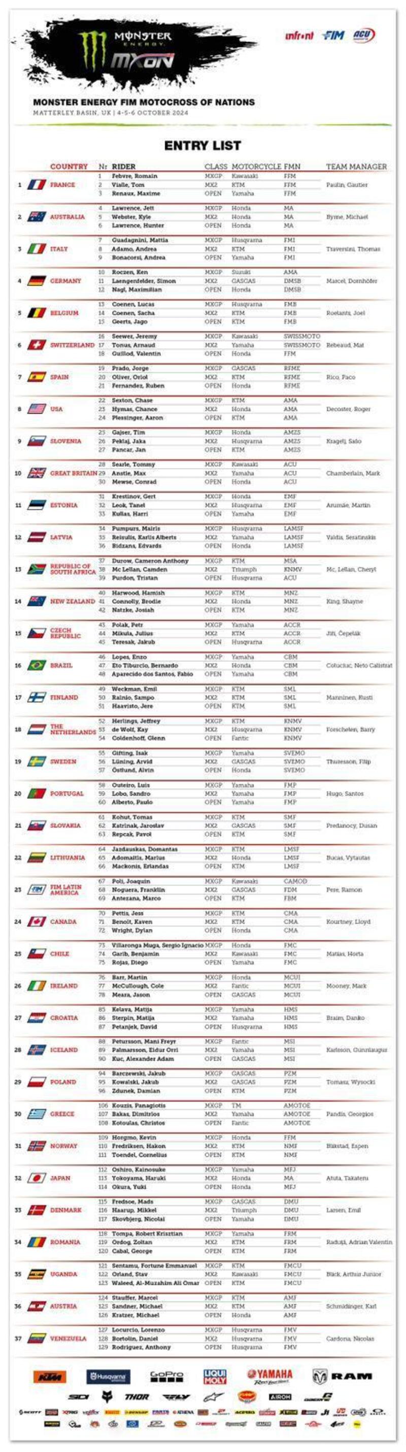 È il caso, come vi avevamo già annunciato, dell’Olanda che schiera Herlings (MXGP), de Wolf (MX2) e Coldenhoff (Open) con quest’ultimo che va a sostituire Vlaanderen fuori per un infortunio. Sempre causa infortunio sono costrette a rivedere le proprie formazioni anche Belgio e USA.