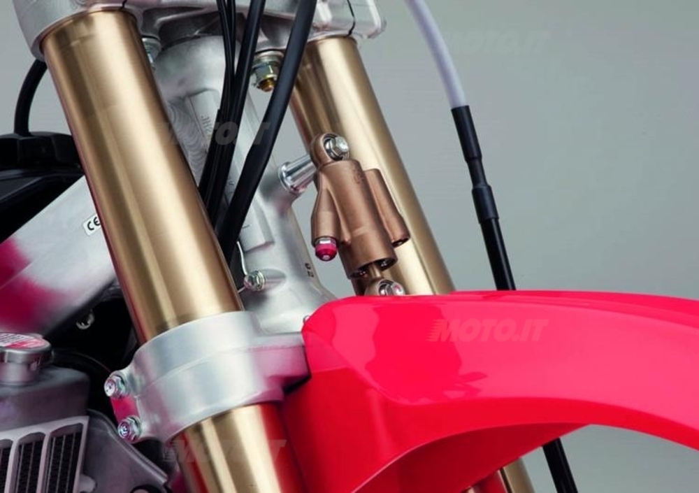 Forcella rovesciata a cartuccia con doppia camera Showa da 48 mm più leggera, con una nuova forma del pompante e un nuovo assetto per una migliore guidabilità, un azionamento ottimizzato e tempi sul giro più veloci. Sospensione posteriore Pro-Link con nuovo assetto dell'ammortizzatore per una migliore guidabilità.