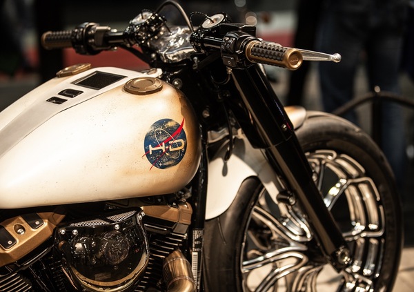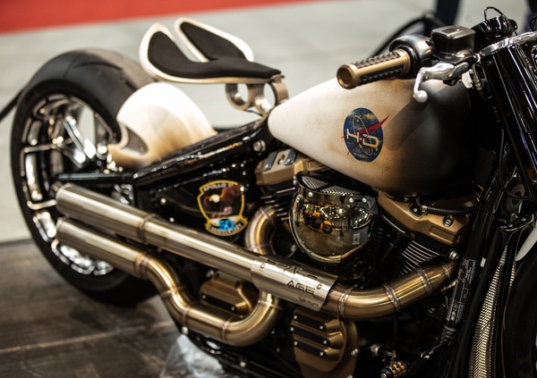 La special di Harley-Davidson Bologna, la straordinaria "Space Age" è basata su modello Harley-Davidson Softail Heritage Classic ed è stata ampiamentepersonalizzata per creare un’opera davvero unica. Nell’anno del 50° anniversario della missione spaziale chiamata APOLLO 11, “Space Age” è un tributo all’epopea dellacorsa alla luna. Tra i richiami alla missione spaziale il logo sul serbatoio in stile N.A.S.A. e il logo sul fianchetto di destra. La particolare verniciatura con effetto bruciato, proprio dei mezzi spaziali al reintro nell’atmosfera terrestre, lascia intuire che la missione si è conclusa riportando i nostri eroi sulla terra.