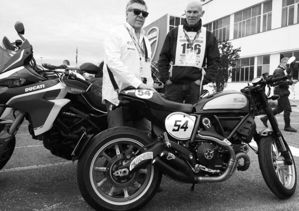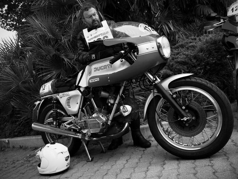 Andiamo avanti, piano e seguendo le frecce. Il road book è scritto sui pali, sui semafori, ad ogni angolo di strada e di muro. E poi i controlli orari, le tabelle di marcia, i “test” della Gara di Regolarità. C’è di tutto, un po’ di tutto fatto bene, confezionato per essere svolto non come un compito ma in seno al desiderio di essere guidati in un’avventura di viaggio e di scoperta straordinari. Emotivamente straordinari. Anche le nostre Moto sono così, mai Moto qualsiasi. Sono le nostre, già, le Moto che abbiamo scelto e curato con attenzione, misurandole sulle nostre emozioni di tutti i giorni, per creare e alimentare quelle sensazioni. Anche un modo per farle vedere all’amico che viene dall’Australia, agli spagnoli con le loro storiche due tempi, alla bionda da capogiro che guida l’impossibile, ai coniugi venuti in vacanza nello stesso modo di sempre, in Moto, all’Ingegnere che guida la Vespa e che vive le sue giornate sullo scooter che è diventata quasi una missione. Ognuno ha la sua moto, la SUA! Noi, per l’occasione, una moderna Ducati, un concentrato tecnologico e di Storia, “mezzo” perfettamente in sintonia con questa Storia del tutto particolare e molto bella.