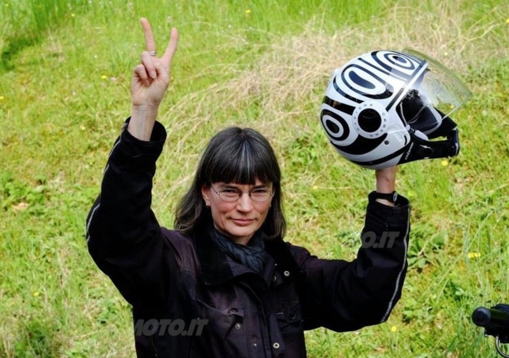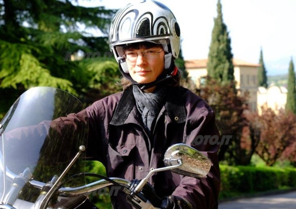 La nostra lettrice Barbara Timme ci mostra, in sella a questa bella Harley-Davidson, il casco Caberg Riviera V2+ Wave dell'evento fotografico tenutosi durante il Motor Bike Expo 2014 e con dedica del nostro Nico Cereghini.