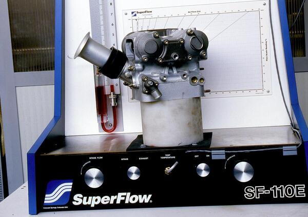Dunque, è opportuno riferire il coefficiente di efflusso non alla semplice luce di passaggio (cioè alla sezione ristretta) ma all’insieme che dalla trombetta porta al cilindro. È per questa ragione che al banco di flussaggio (strumento indispensabile per conoscere il coefficiente in questione) la testa viene montata su di un tubo che simula esattamente il cilindro e inoltre ad essa viene fissata la parte iniziale del condotto completa di corpo farfallato e trombetta di aspirazione.