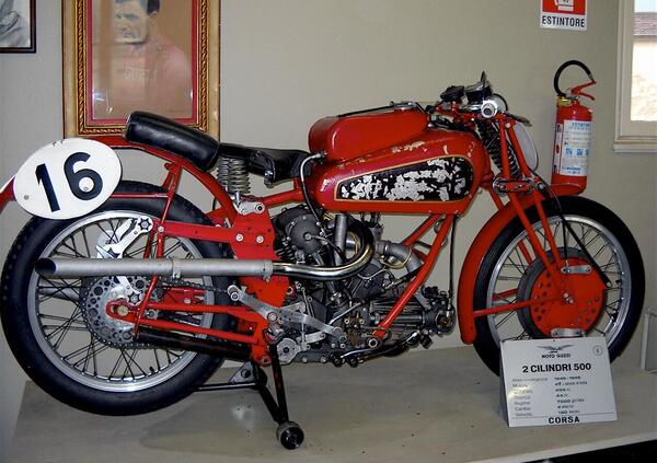 Passando ai bicilindrici, si trovano altri distacchi dalle architetture canoniche da parte di alcuni motori da corsa, invariabilmente a due tempi. Quando la Guzzi ha deciso di montare due gruppi testa-cilindro della 250 da competizione su di un medesimo basamento per realizzare un bicilindrico di 500 cm3 ha scelto di disporli a V di 120°. Poiché l’anteriore era orizzontale, il posteriore era inclinato all’indietro di 30°.