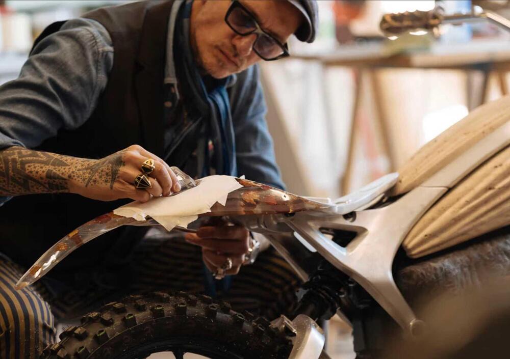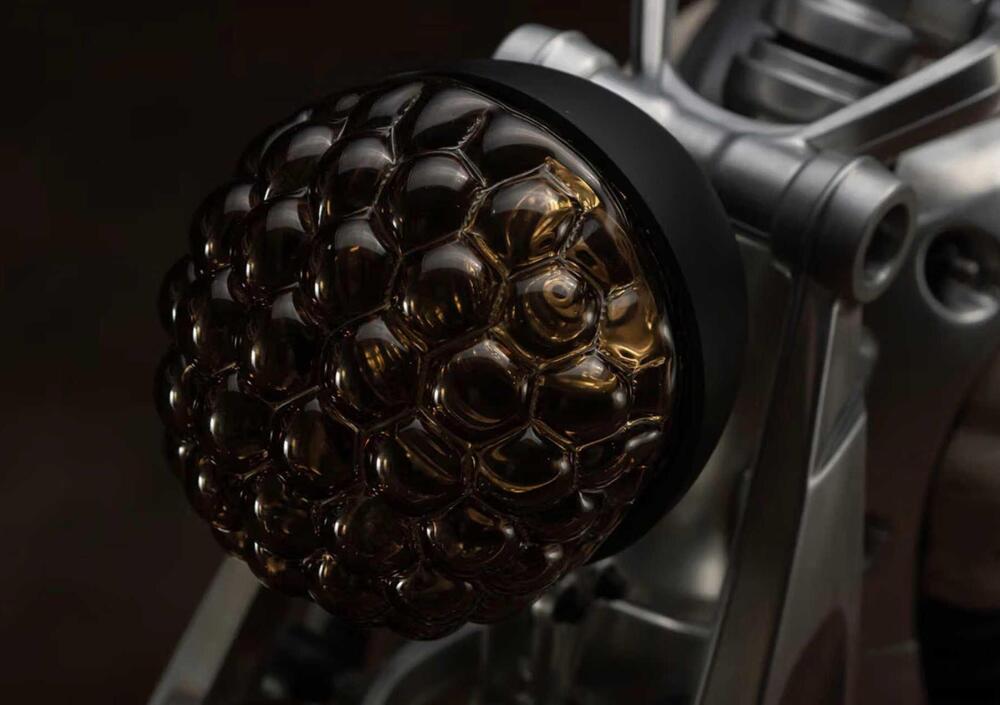 Biagi ha trasformato la Flying Flea FF.C6 (la full electric con oltre 40 brevetti) in un totem scultoreo. Pensate che il serbatoio è realizzato in travertino, scolpito a mano per richiamare le forme di un paracadute, i fari sono realizzati a mano in vetro soffiato mentre le manopole sono fusioni in bronzo che ricalcano le impronte digitali dell’artista.