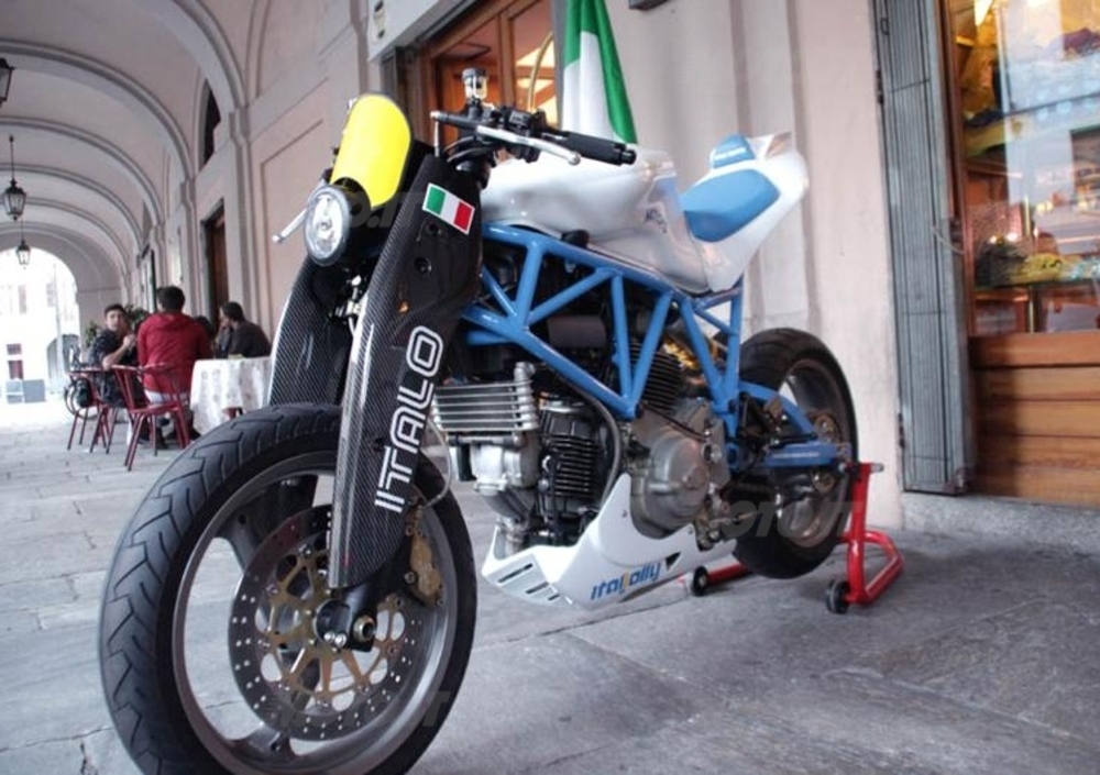 I semimanubri sono della WP Racing, mentre il gruppo ottico anteriore è stato mutuato da un bobber americano e conferisce all’avantreno un aspetto più “muscoloso”, obiettivo a cui concorrono le cover in fibra di carbonio con decalcomania “Italo” impiegate per rivestire la forcella. Di serie invece le pedane, che sono però state riverniciate e alleggerite nei paratacchi con un’operazione di foratura, mentre la sella è stata sostituita con una in gel, più comoda dell'originale.