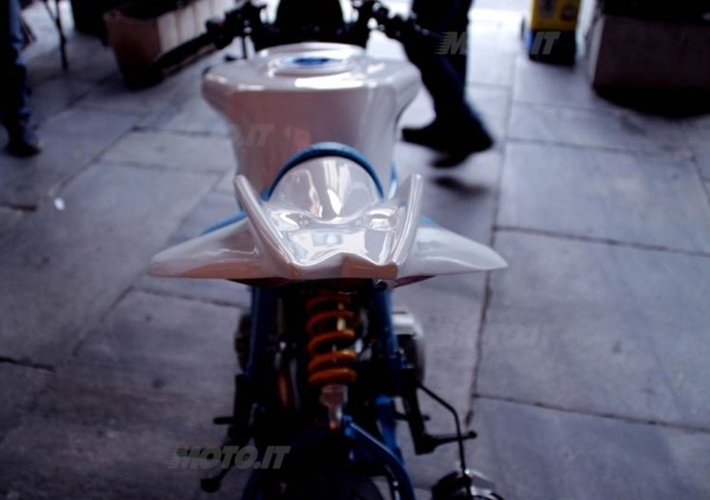 Il problema nella realizzazione di questa special è stato il riposizionamento delle bobine che nell'originale sono vincolate alla carenatura. E' stato quindi necessario ricollocarle in altri punti della moto: una ad esempio è stata all’interno del puntale caratterizzato da un disegno a freccia negativa.