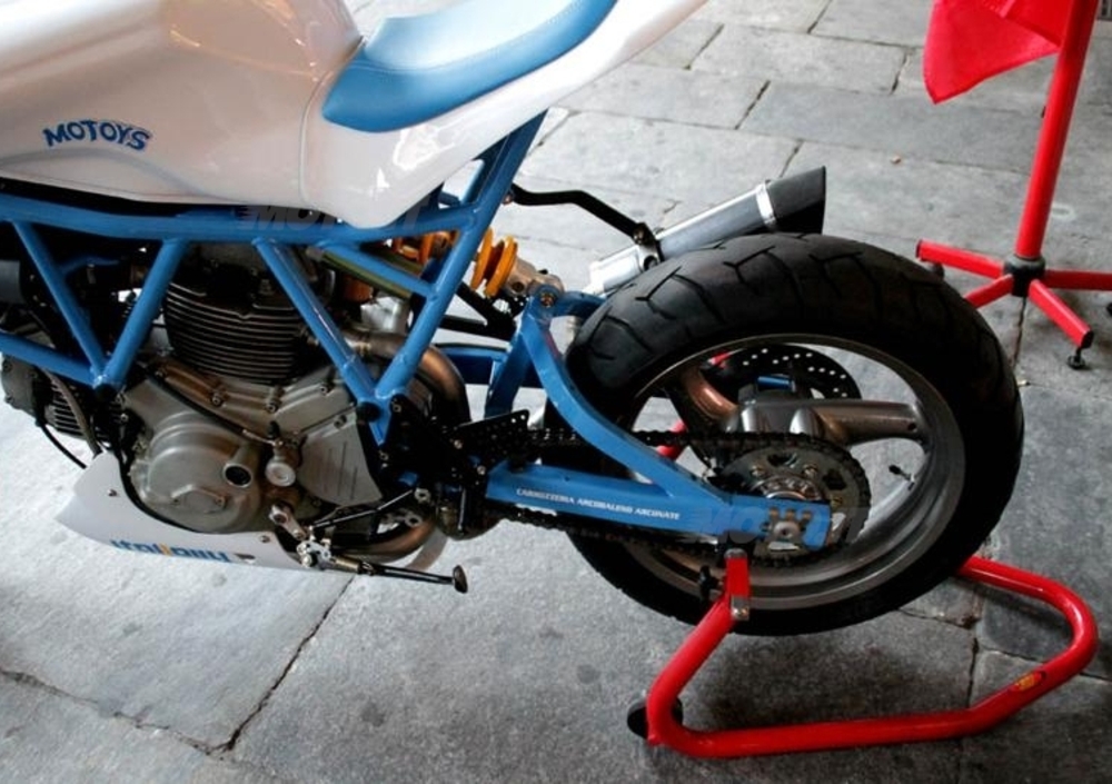 Numerose le componenti modificate e di provenienza esterna al fine di trasformare una Ducati SuperSport 750 del 2002 in qualcosa di unico. Il codino proviene da un’Aprilia RSV4, mentre la ciclistica è sostanzialmente rimasta inalterata, sia per mantenere il buon equilibrio dinamico della moto che per non incidere eccessivamente sui costi di trasformazione.