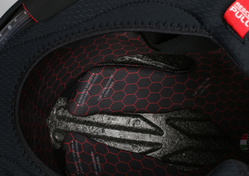 Profondi cambiamenti per il casco super sportivo Pista GP. Nella sua nuova versione R è stato totalmente riprogettato. La calotta esterna è tutta in fibra di carbonio, realizzata in quattro dimensioni per coprire le sette taglie disponibili che vanno dalla XS a XXL. Le calotte interne sono in polistirolo con struttura a cinque densità. Nella sua taglia più piccola (S), il Pista GP R ha un peso dichiarato in 1.350 grammi.