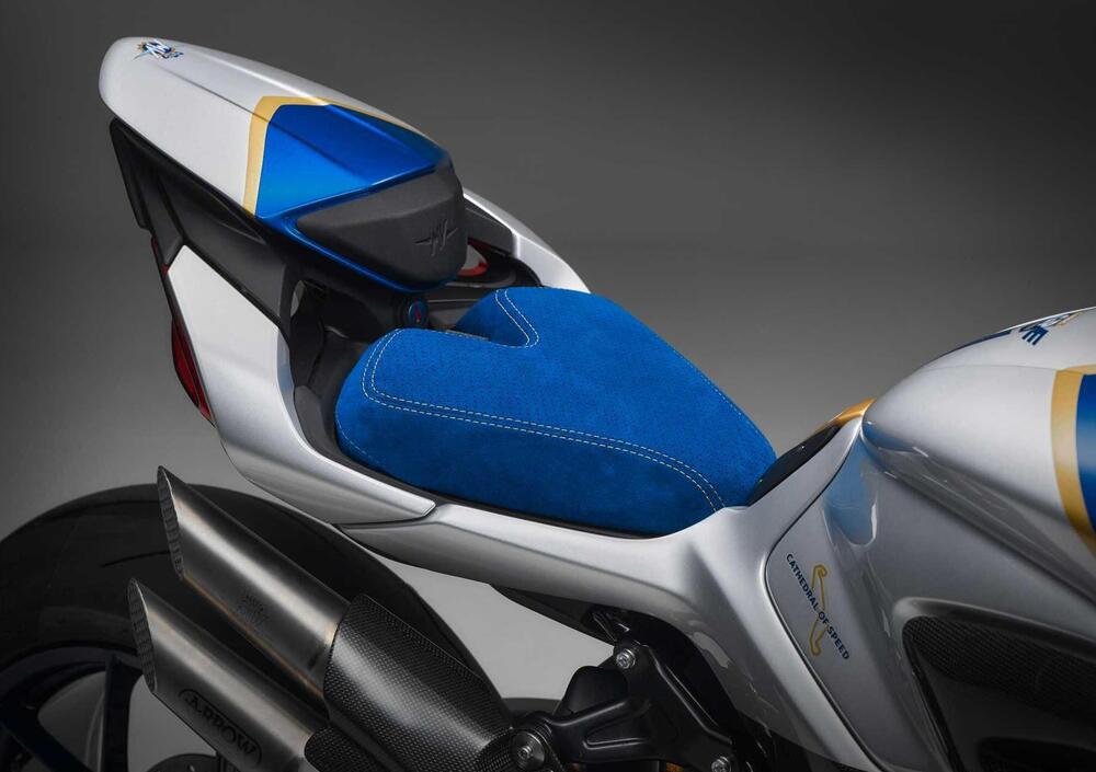 La livrea prevede alcune parti del telaio in argento, come piastre laterali in alluminio e il forcellone monobraccio, mentre la sella è rivestita in Alcantara blu, tinte che ritroviamo nel serbatoio con doppia colorazione blu/argento e finitura lucida.
