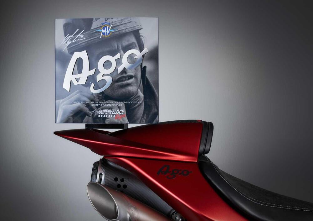 La cinghia in pelle Superveloce sul serbatoio riporta una placca dorata con la scritta "15 Titoli Mondiali", e la sella in Alcantara nera è ricamata con il nome Agostini e le iconiche strisce a freccia della sua tuta da corsa, completate dal logo MV Agusta.