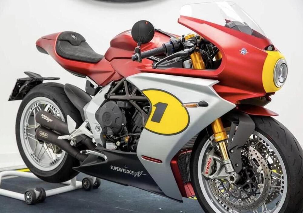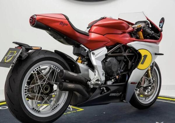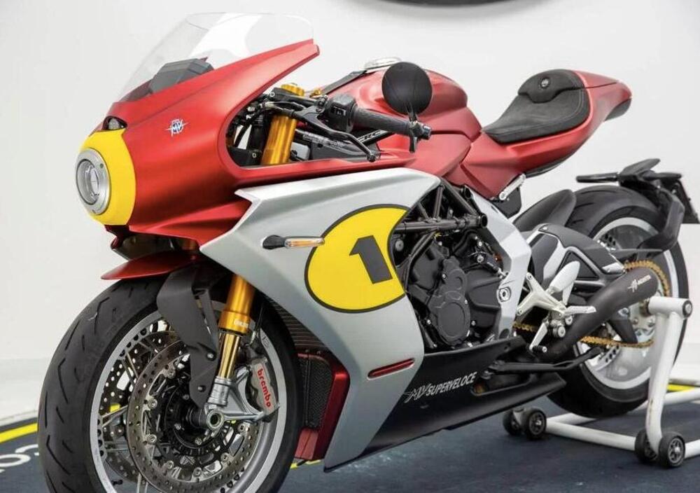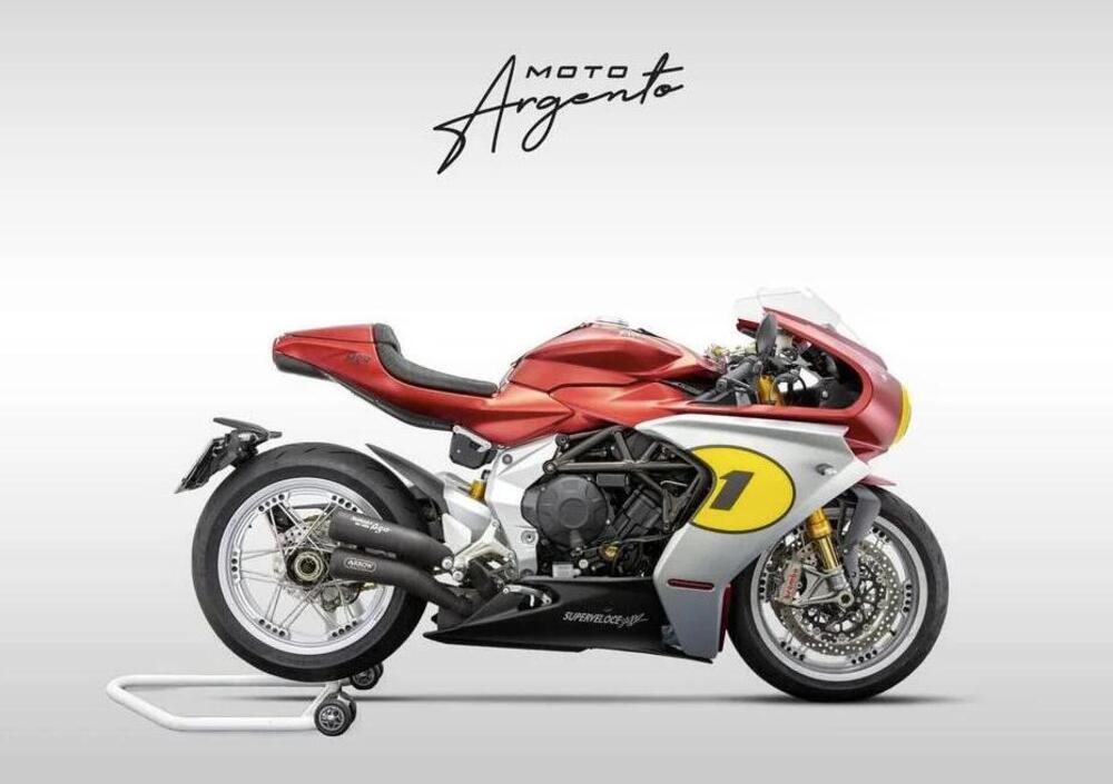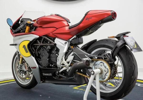 Se pensavate che questo fosse abbastanza bene, questa era la Superveloce "standard" la Ago è una moto da collezione e si distingue dalla Superveloce 800 "standard" per la sua esclusiva colorazione rosso-argento, con tabelle portanumero in giallo ispirate alle MV 500 da corsa, e per l'abbondante utilizzo di parti in fibra di carbonio. Tra queste troviamo i fianchi della carenatura, il copricodino monoposto, la paratia sottosella, lo spoiler del parafango anteriore e posteriore, le uscite d'aria sulle fiancate della carenatura, il copricatena e la protezione del forcellone. Oltre a ciò, spiccano la targhetta numerata sul serbatoio e la firma di Agostini, confermando l'esclusività del modello.