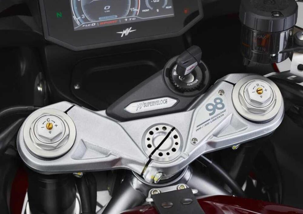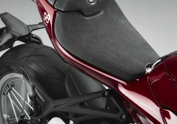 La sigla “98 Edizione Limitata” è posta lateralmente sul codino e poi nella sua parte superiore, cartterizza questi 300 esemplari costruiti nello stabilimento di Schiranna, sulle rive del lago di Varese. Il riferimento storico alla cilindrata del motore progettato nel 1943 e alla tiratura in serie limitata fa bella mostra anche sulla piastra di sterzo, grazie alla tecnologica incisione laser, ed è rimarcata dal certificato di autenticità, consegnato all’acquisto della moto.
