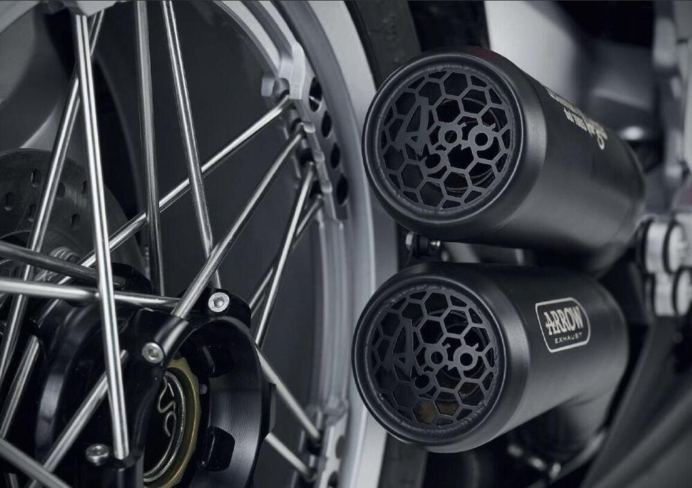A corredo viene fornito il Kit Racing che fra le altre cose comprende l'impianto di scarico Arrow nero opaco a tre terminali (due sul lato destro della moto e uno su quello sinistro come sulle famose tre cilindri da corsa) omologato per l'uso stradale e la centralina con mappatura dedicata.