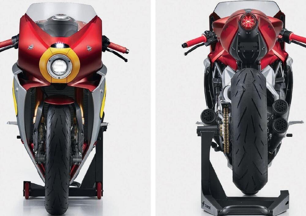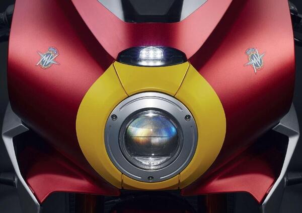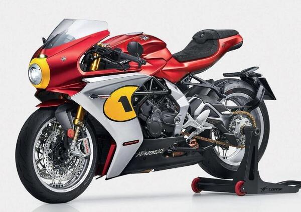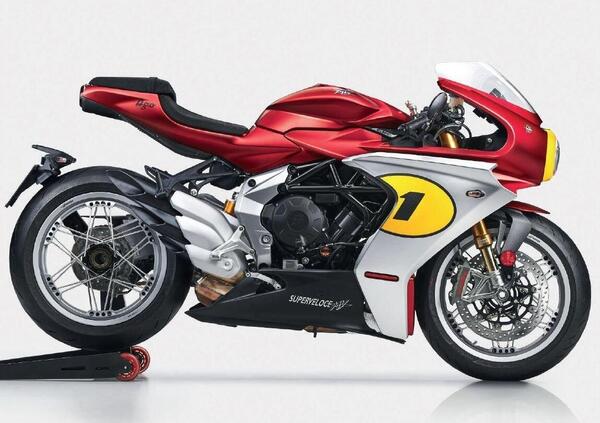 La moto è costruita sulla base della Superveloce 800 aggiornata quest'anno e si distingue a colpo d'occhio per la colorazione rosso-argento con tabelle portanumero in giallo come sulle MV 500 da corsa.