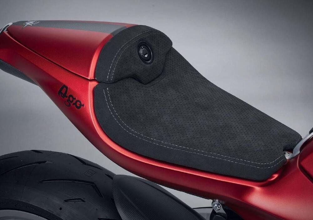 Ci sono poi il terminale di scarico di nuovo disegno, la sella rivestita in Alcantara, la firma di Agostini riportata sul serbatoio, il tappo della benzina lavorato in CNC e con cinghia in cuoio sul dorso del serbatoio, piastra superiore di sterzo forgiata e plexiglas del cupolino rialzato e arrotondato.